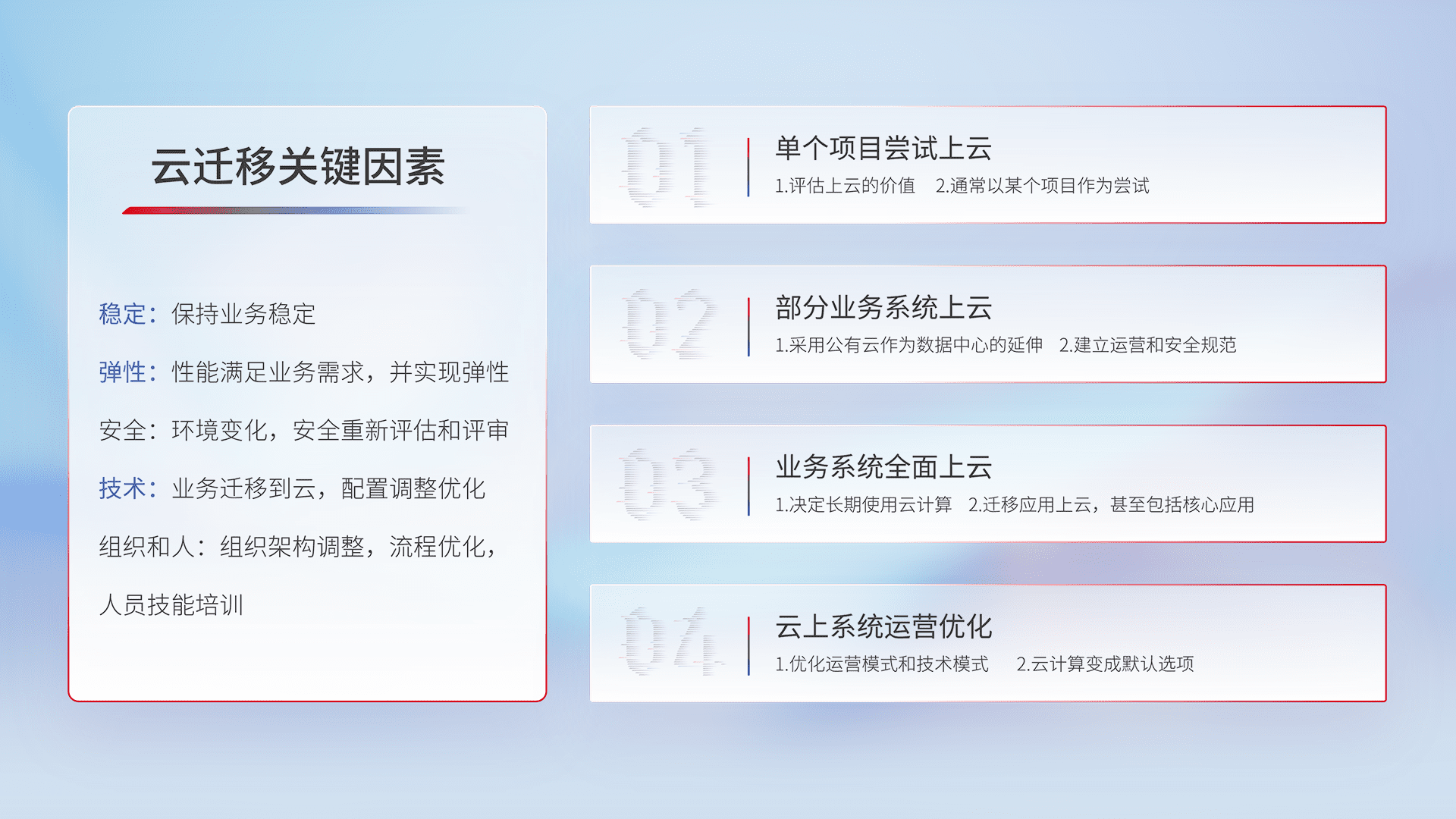 结合实际业务,,,,从规划设计、、、云平台选型、、、云原生改造、、数据迁移、、、集成交付,,,,迁移全过程为客户识别最佳上云路径,,,做好风险识别管理,,,,设计网络架构、、身份权限、、、、安全审计合规、、、操作审计、、、、日志审计、、、、监控告警策略、、、、多站点容灾设计等,,对云上基础设施进行整体规划,,,,提升IT治理水平,,,,以满足弹性、、、高可用、、、高性能的需求。。。。